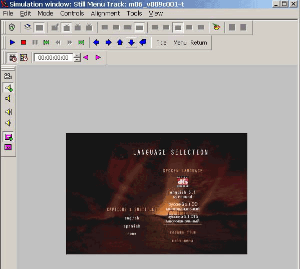 Simulation Window программно симулирует работу DVD плеера, выполняя все скрипты и команды DVD-Video диска. Поэтому, прежде чем создавать образ DVD-Video диска, нужно проверить его работоспособность на симуляторе. Данное окно всегда запускается с тем загруженным компонентом диска, который был активен в основном рабочем окне. В нашем случае это таймлиния фильма, со всеми видео, аудио дорожками и субтитрами. Окно имеет два основных режима работы. Первый — это Design Mode, а второй — Simulation Mode. В режиме Design Mode вы можете изменять тот объект, с которым вы в данный момент работаете, например, изменять меню, расположение его кнопок, добавлять субтитры на таймлинию и т.д. В Simulation Mode вы проверяете работоспособность этого объекта.