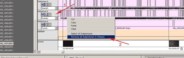 Как можно видеть, эта дорожка имеет шесть дорожек субтитров, по две на каждый из языков (Wide и Pan&Scan), а языка у нас три: английский, испанский и французский. Давайте изменим субтитры на дорожке Subpicture 5. Выделяем эту дорожку (рис.64, п.1), щелкнув по ней мышкой, нажимаем правую кнопку мышки и выполняем команду Remove all Subpictures in Stream (рис.64, п.2). Мы только что удалили все существующие субтитры на этой дорожке (не забывайте об отсутствии возможности отмены действия в данной программе). Далее изменяем язык этой дорожки на русский: