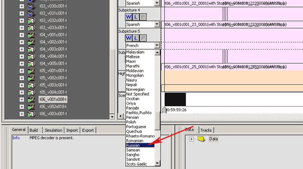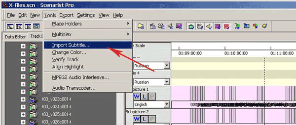В данном случае мы создаем текст красного цвета с черной окантовкой. Операция несложная: в Photoshop создаем шаблон для текста, после чего лишь меняем текст в текстовом слое и сохраняем файлы с нужным названием в папке 07_Russian_W. Можно, конечно, воспользоаться и специальными программами, к примеру, Subtitle Workshop. После того, как весь текст переведен, наш материал готов для импорта в Scenarist. Вернемся в эту программу. Откроем вкладку Track Editor и найдем ту самую дорожку, на которую мы добавляли русскую аудиодорожку. Напоминаем, данная дорожка имеет название t06_v001x008_t.