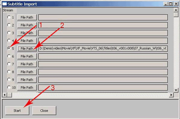 Включаем радиокнопку номер 5, так как мы работаем с пятой дорожкой субтитров (рис.67, п.1), нажимаем кнопку File Path и выбираем файл .SST, который мы приготовили (рис.67, п2), после чего нажимаем кнопку Start (рис.67, п3). Начнется процесс импорта субтитров. После того, как этот процесс закончится, закрываем окно импорта. Новые субтитры импортированы и размещены на пятой дорожке.