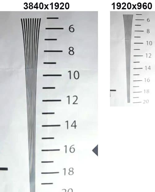 Нетрудно представить, что измерение разрешающей способности камеры серьезно осложняется сверхсильными оптическими искажениями типа «рыбий глаз». Тем не менее, мы произвели съемку части тестовой таблицы, распечатанной на нескольких листах, направив один из объективов в центр мишени. Затем в видеоредакторе к нужной половине кадра был применен фильтр, устраняющий сферические искажения, которые дают все экшн-камеры. Полученная картинка была сопоставлена с оригинальной таблицей так, чтобы высота ключевых объектов в таблице и нашей съемке совпадала. Результат оказался вполне пригодным для наглядной оценки разрешающей способности камеры.