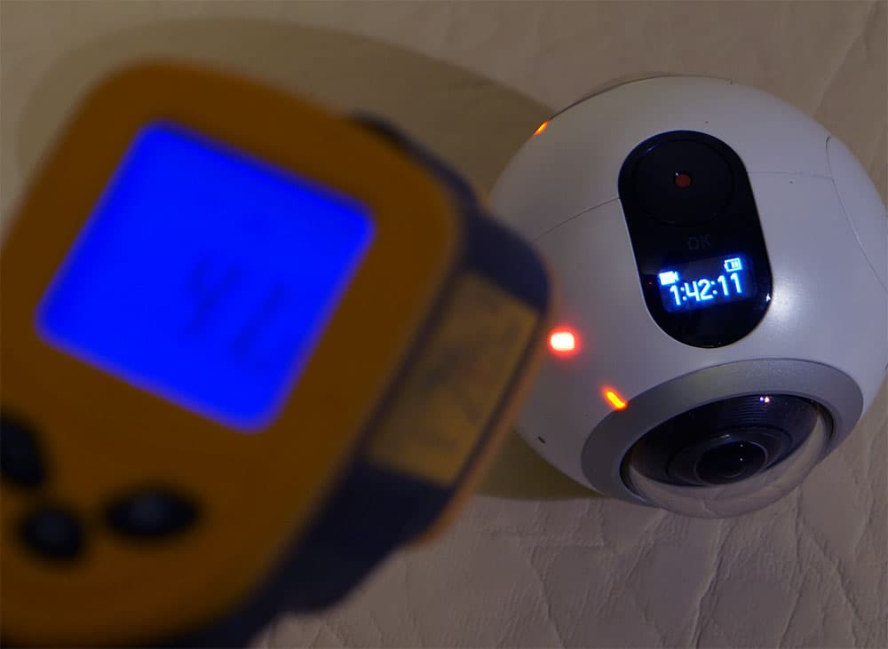 Во время длительной записи температура некоторых элементов конструкции достигает 50 °C, после чего камера отключается для охлаждения. Нагрев электронных компонентов происходит небыстро, хотя все зависит от температуры окружающей среды. Во время нашего тестирования камера до первого своего отключения вследствие перегрева производила непрерывную видеозапись в формате 3840×1920 30p с выключенными Wi-Fi и Bluetooth, однако по достижении 29 минут произошло аварийное отключение аппарата (тестирование проводилось в помещении при температуре около 20 °C). Длительная съемка на улице погожим осенним днем при температуре 14 °C не приводит к таким отключениям.