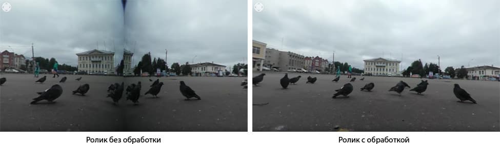 Увидеть этот эффект в живом видео можно с помощью следующих роликов. При просмотре роликов, прошедших особую обработку, сходу и не определишь, где именно расположен шов двух полусфер — настолько тщательно произведено программное склеивание.