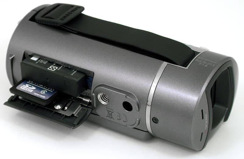 В днище камеры имеется откидывающаяся крышка, под которой расположены слот для карты памяти и гнездо аккумулятора. Данный аккумулятор позволяет вести видеозапись в течение 85 минут с открытым экраном в режиме 1280×720 50p.
