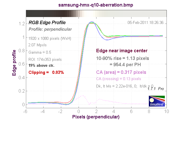График хроматической аберрации (на самом деле, это тот же краевой профиль, только построенный по каждому цвету в отдельности). При значении параметра CA (area) равного 0–0,5 хроматическая аберрация незаметна.