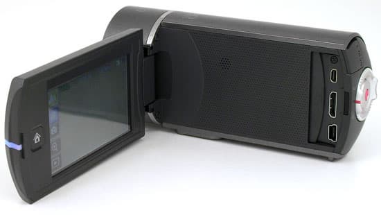 Хм, даже на кнопке включения сэкономлено? Да, так и есть. Похоже, эта кнопка становится не имеющим смысла артефактом, от которого данную модель камеры было решено избавить. Под ЖК-экраном тоже пусто, если не считать встроенного динамика. Ближе к торцу аппарата имеется сдвижная дверца, под ней — композитный аудио/видеовыход, HDMI-выход и USB-порт.