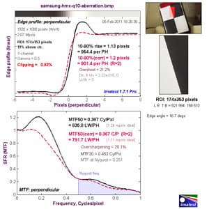 Верхний график представляет собой краевой профиль, для которого приведено значение 10–90% rise distance в пикселях, а нижний график представляет собой MTF (Modular Transfer Function — функция передачи модуляции), для которой приведен параметр MTF50 в циклах на пиксель. Краевой профиль и MTF камеры показаны черной линией. Красной пунктирной линией обозначен краевой профиль и MTF, которые программа Imatest считает близкими к оптимальным. 10–90% rise distance и MTF50 также являются расчетными величинами Imatest.