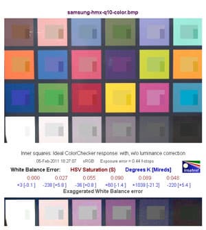 Средняя строчка цифр показывает нам численную оценку ошибки баланса белого в единицах цветового пространства HSV. Так, цифры красного цвета обозначают ошибку по координате S — saturation (насыщенность), цифры синего цвета — в градусах Кельвина [Миредах (Mireds)]. При значении S < 0,02 (речь идет об ошибке по координате S в HSV), ошибка практически незаметна, а при ошибке S > 0,10 она видна, особенно на нейтральных полях большой яркости.