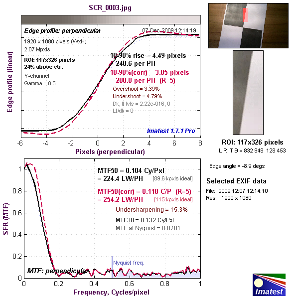 Верхний график представляет собой краевой профиль, для которого приведено значение 10-90% rise distance в пикселях, а нижний график представляет собой MTF (Modular Transfer Function — функция передачи модуляции), для которой приведен параметр MTF50 в циклах на пиксель. Краевой профиль и MTF камеры показаны черной линией. Красной пунктирной линией обозначен краевой профиль и MTF, которые программа Imatest считает близкими к оптимальным. 10-90% rise distance и MTF50 также являются расчетными величинами Imatest.