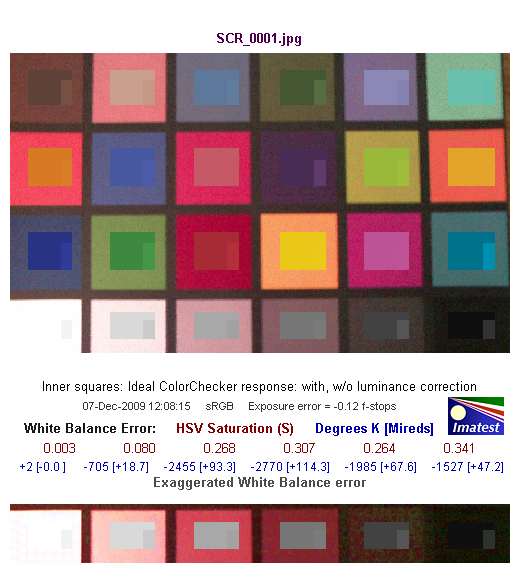 Средняя строчка цифр показывает нам численную оценку ошибки баланса белого в единицах цветового пространства HSV. Так, цифры красного цвета обозначают ошибку по координате S — saturation (насыщенность), цифры синего цвета — в градусах Кельвина [Миредах (Mireds)]. При значении S < 0.02 (речь идет об ошибке по координате S в HSV), ошибка практически незаметна, а при ошибке S > 0.10 она видна, особенно на нейтральных полях большой яркости.