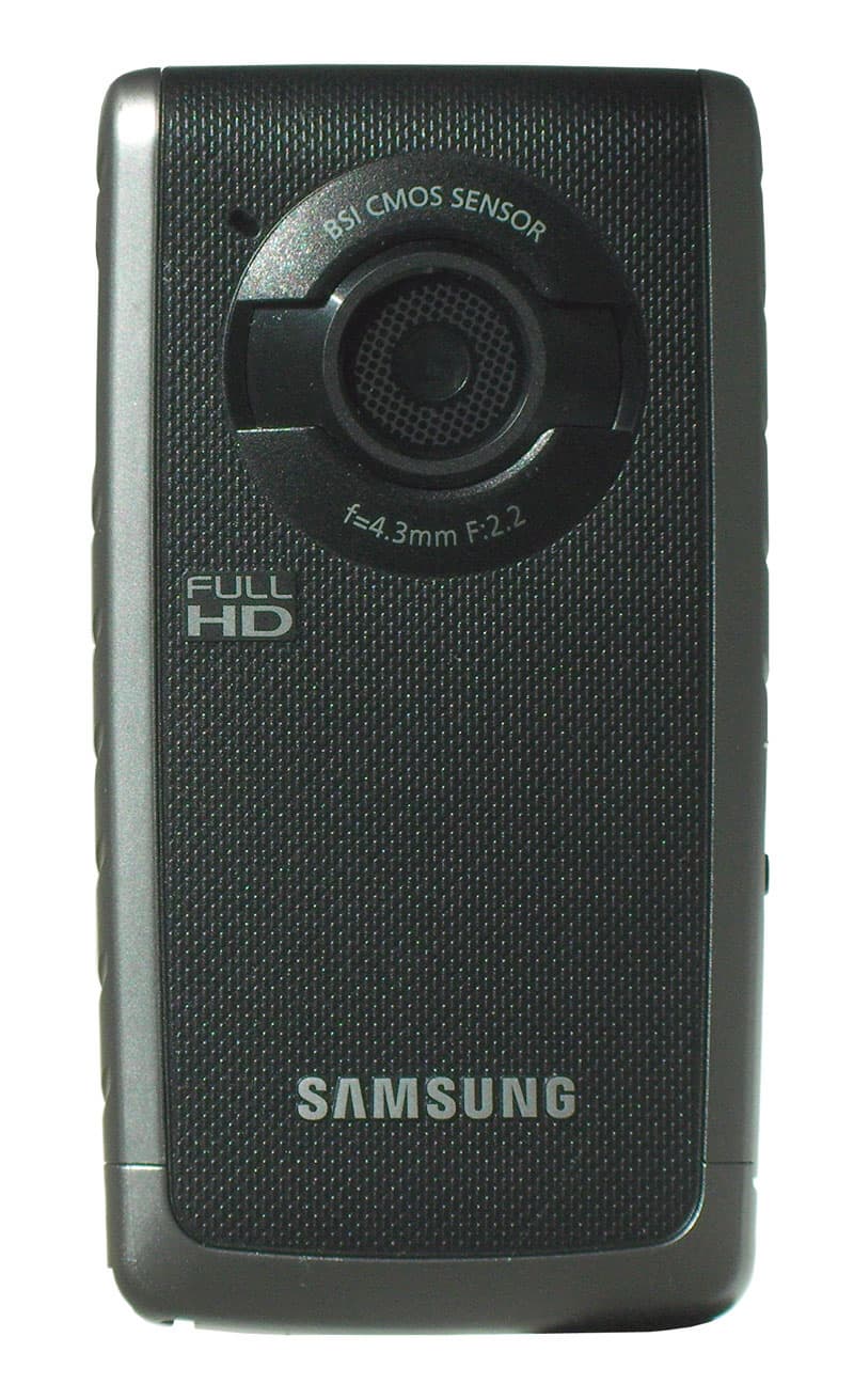 Стекло объектива защищено чуть выступающими вперёд декоративными арками, таким образом, его не поцарапаешь, даже если камеру положить на жёсткую поверхность. Надпись на объективе предупреждает, что в аппарате используется BSI-сенсор — датчик с обратной засветкой, который гораздо чувствительнее, чем обыкновенный. Слева от объектива расположен встроенный микрофон, защищённый водонепроницаемой мембраной.