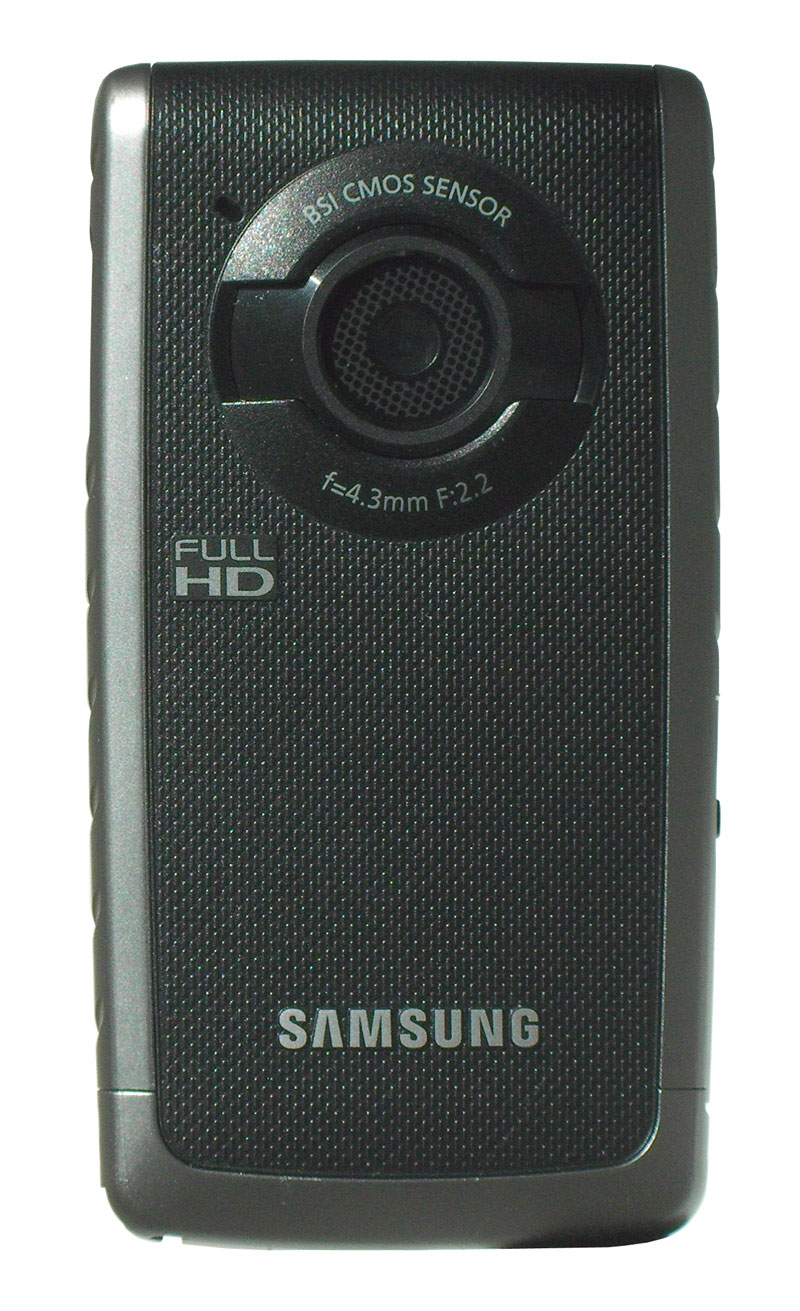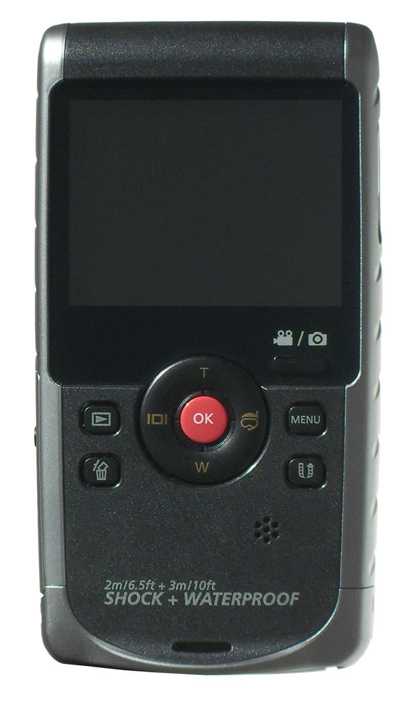Стекло, которым прикрыт ЖК-экран, не утоплено в корпус — и это правильно! Здесь нет противной рамки, в углах которой так любит скапливаться пыль и грязь. В нижней части стекла размещена кнопка, переводящая камеру из режима камкордера в режим фотоаппарата, и обратно. Ниже, на корпусе, имеется четырёхпозиционная кнопка-кольцо, функции которой меняются в зависимости от режима работы камеры. В центре кольца — подтверждающая кнопка, она же служит кнопкой начала/останова записи и/или создания фотоснимка. Слева и справа от кольца размещены дополнительные кнопки управления: перевод в режим плеера, удаление файла, вызов меню и кнопка паузы записи.