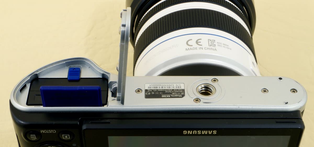 Дно камеры снабжено откидной крышкой, под которой находится слот карты памяти и аккумулятор. Расположение резьбового отверстия для крепления штативной площадки можно назвать удобным: если площадка небольшая, то открыть батарейный отсек для оперативной замены аккумулятора или карты памяти, не снимая камеру со штатива — вполне осуществимая операция.