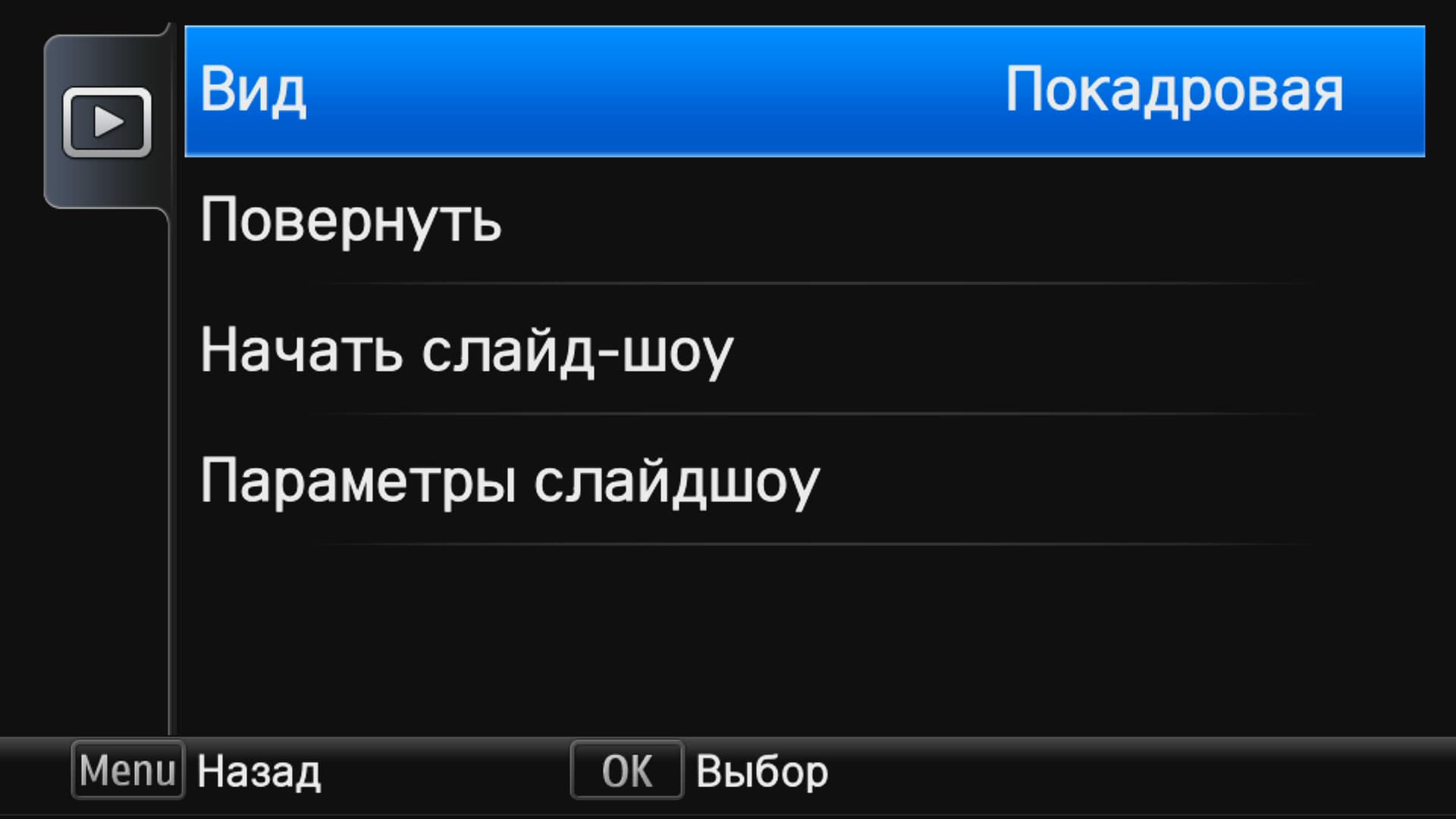 | Служебное меню фотоаппарата в режиме плеера | Просмотр фотослайдшоу на телевизоре (видны подсказки по кнопкам телевизионного пульта ДУ) |