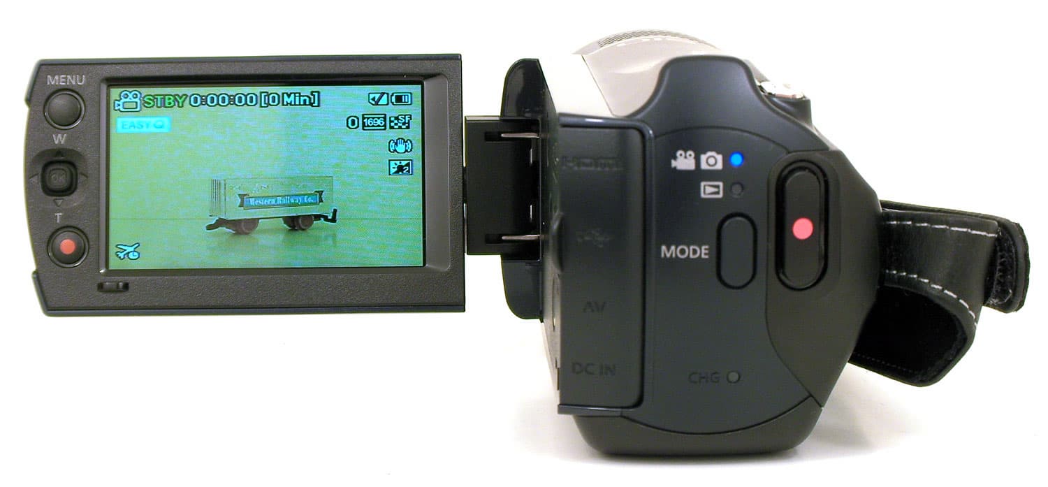 ЖК-экран видеокамеры снабжён двумя дублирующими кнопками: MENU и REC. Между ними расположен пятипозиционный джойстик для навигации по меню.