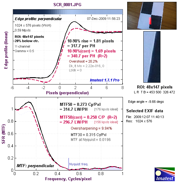 Верхний график представляет собой краевой профиль, для которого приведено значение 10-90% rise distance в пикселях, а нижний график представляет собой MTF (Modular Transfer Function — функция передачи модуляции), для которой приведен параметр MTF50 в циклах на пиксель. Краевой профиль и MTF камеры показаны черной линией. Красной пунктирной линией обозначен краевой профиль и MTF, которые программа Imatest считает близкими к оптимальным. 10-90% rise distance и MTF50 также являются расчетными величинами Imatest.