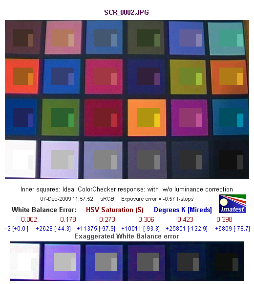 Средняя строчка цифр показывает нам численную оценку ошибки баланса белого в единицах цветового пространства HSV. Так, цифры красного цвета обозначают ошибку по координате S — saturation (насыщенность), цифры синего цвета — в градусах Кельвина [Миредах (Mireds)]. При значении S < 0.02 (речь идет об ошибке по координате S в HSV), ошибка практически незаметна, а при ошибке S > 0.10 она видна, особенно на нейтральных полях большой яркости.