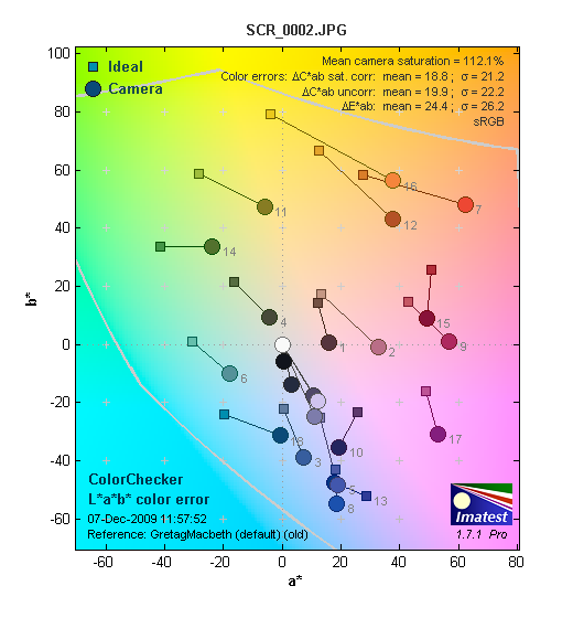 На следующей диаграмме в графической форме представлены отклонения зарегистрированных камерой цветов от идеала в цветовом пространстве CIE LAB. Данная диаграмма отклонения в Lab показывает на сколько камера дает ошибку при передаче цвета.