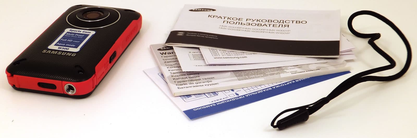 В комплекте с Samsung W300 имеется лишь скромный ремешок для фиксации камеры на ладони и инструкция с листовками. А как же кабели, зарядные устройства? Не нужны эти аксессуары: разработчик предпринял соответствующие меры, благодаря которым пользователь не потеряет шнурки и адаптеры в глубинах своего отпускного чемодана. Не потеряет, потому что их нет.