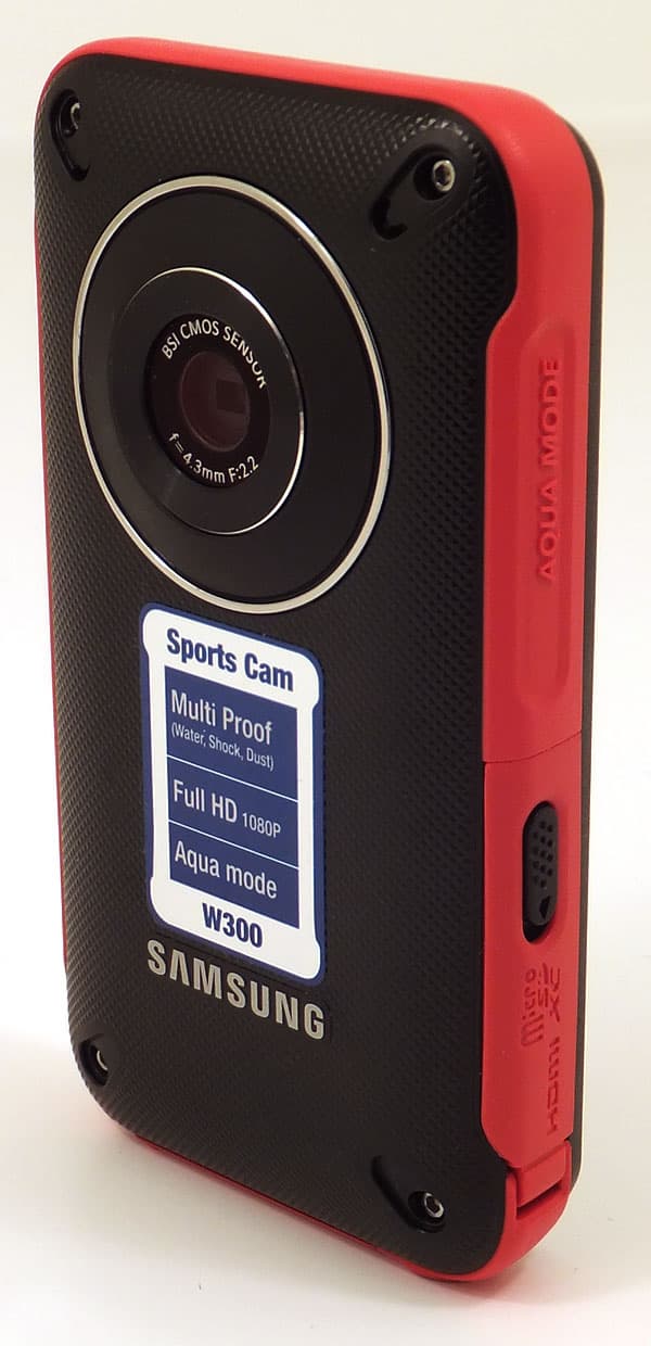 Конструкция камеры почти не отличается от дизайна аппарата с индексом 200, обзор которого был опубликован аккурат год назад. Лишь на лицевой панели, той, где находится объектив, появились суровые винты, напоминающие о водостойкости устройства. Под двумя верхними винтами имеются защищённые углубления — там прячется микрофон, направленный вперёд. Рельефный рисунок, нанесённый на пластик этой лицевой панели, позволяет цепко удерживать камеру в руках, не давая ей выскользнуть из пальцев даже под водой. Удержанию аппарата также способствуют боковые грани тонкого корпуса, выполненные из резиноподобного пластика красного цвета.