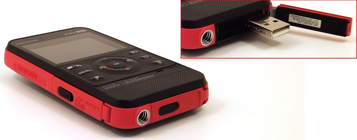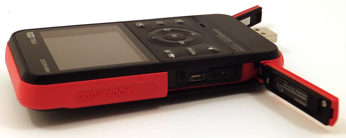 На правой грани камеры видна защёлка герметичного отсека, под которым спрятан слот для карты памяти формата micro SD/SDHC/SDXC и видеовыход micro HDMI. Обратите внимание — именно MICRO, а не MINI.
