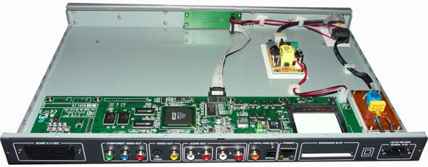 На него и возложены все функции по декодированию видео, аудио и графической информации. За сетевой интерфейс отвечает чип DM9000 от компании Davicom. В расположенный на задней стенке разъем Expansion Slot может вставляться ShowCenter WiFi Upgrade, пока им может быть только PCMCIA-адаптер 802.11b, но уже анонсирован «джишный» апгрейд, который необходимо «намертво» впаивать внутрь корпуса в гарантийном отделе. Любопытно смотрится крохотный импульсный блок питания.