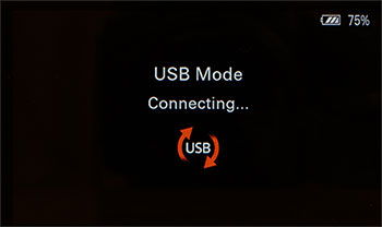 При подключении сетевого адаптера питания камера, будучи включенной, переходит в один из трех режимов, которые заранее выбираются в настройках: Съемный диск, MTP или Удаленный ПК (но лучше оставить автоматический режим). Зарядка аккумулятора при этом не производится — она начнется, только если повернуть рычажок питания в положение Off.