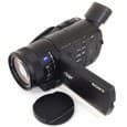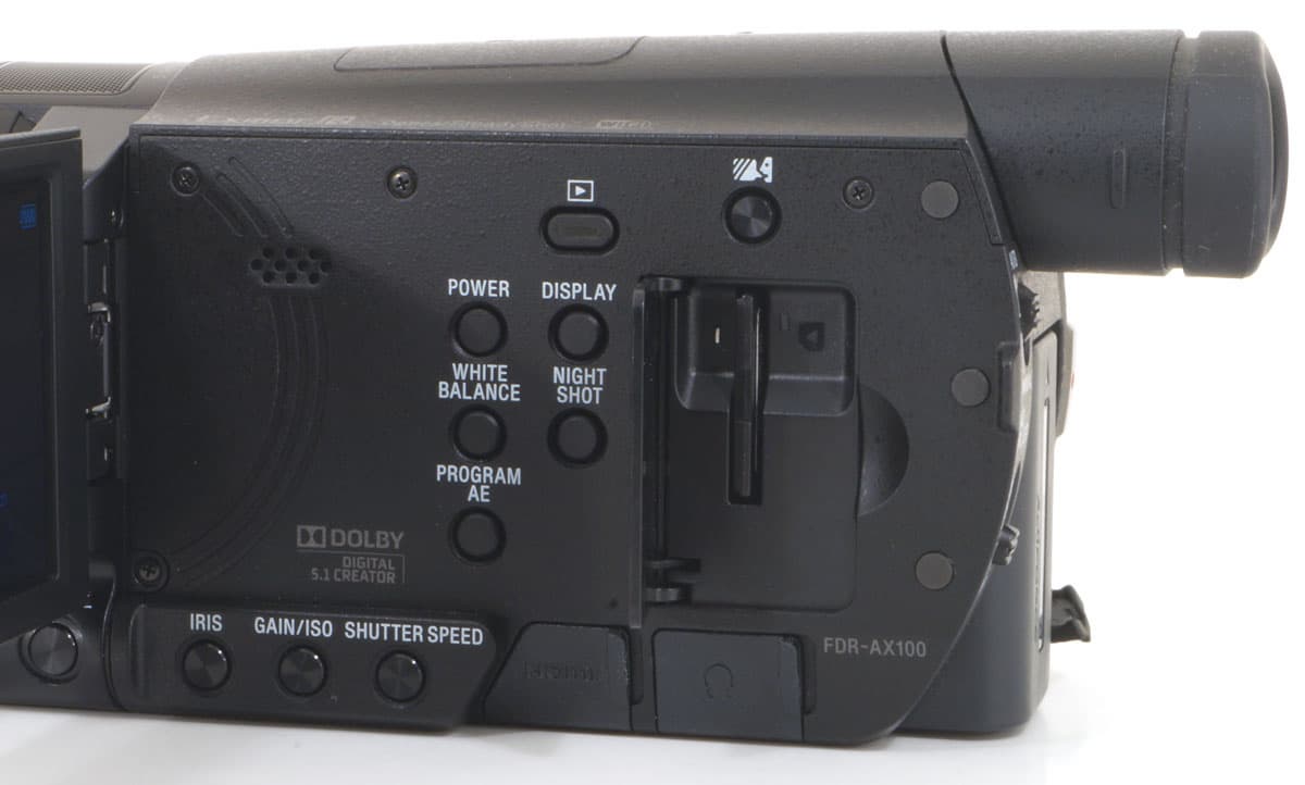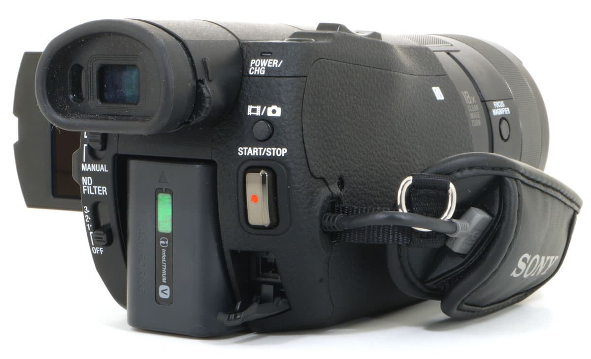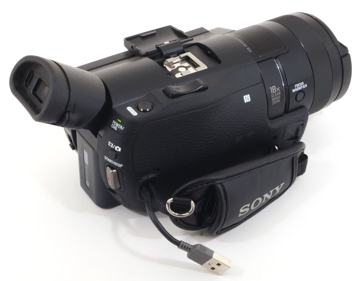 Камера оснащена видоискателем, это важнейший определяющий признак аппарата высшего ценового диапазона, или топ-класса. Данный видоискатель имеет поворотно-выдвижную конструкцию и оснащен датчиком приближения для автоматической активации. Справа от видоискателя находится кнопка, переключающая аппарат из режима камкордера в режим фотоаппарата, а под ней — неизменная REC, отмеченная красным кружком. Под этой кнопкой находится откидная крышка, где прячется разъем для подключения сетевого адаптера питания.