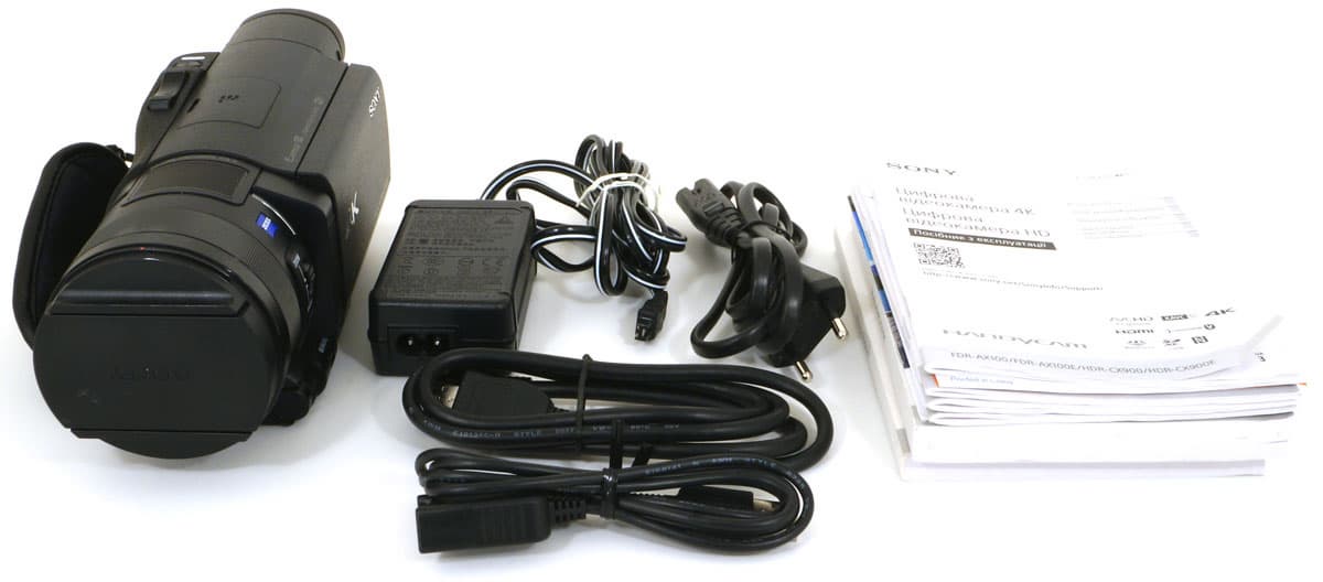 В комплекте с видеокамерой нам достались сетевой адаптер питания, кабель micro HDMI — HDMI, USB кабель, несколько листовок и кратких руководств пользователя на разных языках.