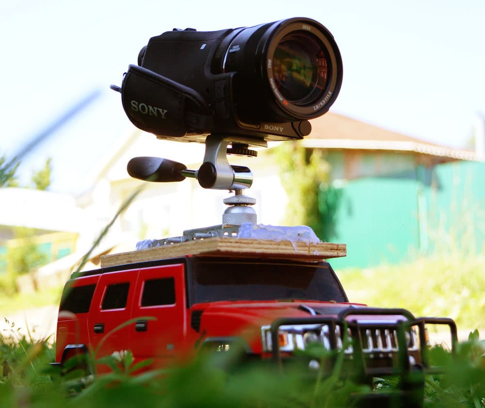 Теперь закрепим материал, проведя видеосъемку с электромобильчика — давно известно, что большинство синтетических измерений не имеет никакой практической ценности. Здесь нас поджидали знакомые сложности, с которыми мы уже встречались при попытках прокатить на этой автомодельке фотоаппараты. Тяжелым зеркальным фотокамерам, как и рассматриваемой почти килограммовой видеокамере, крайне неуютно на таком хиленьком постаменте — крепление не выдерживает большого веса, так как изначально было рассчитано на легкие «наладошечные» любительские камеры. Посему нужно подумывать об оснащении автомобильчика каким-то более серьезным креплением-площадкой с низким «клиренсом».