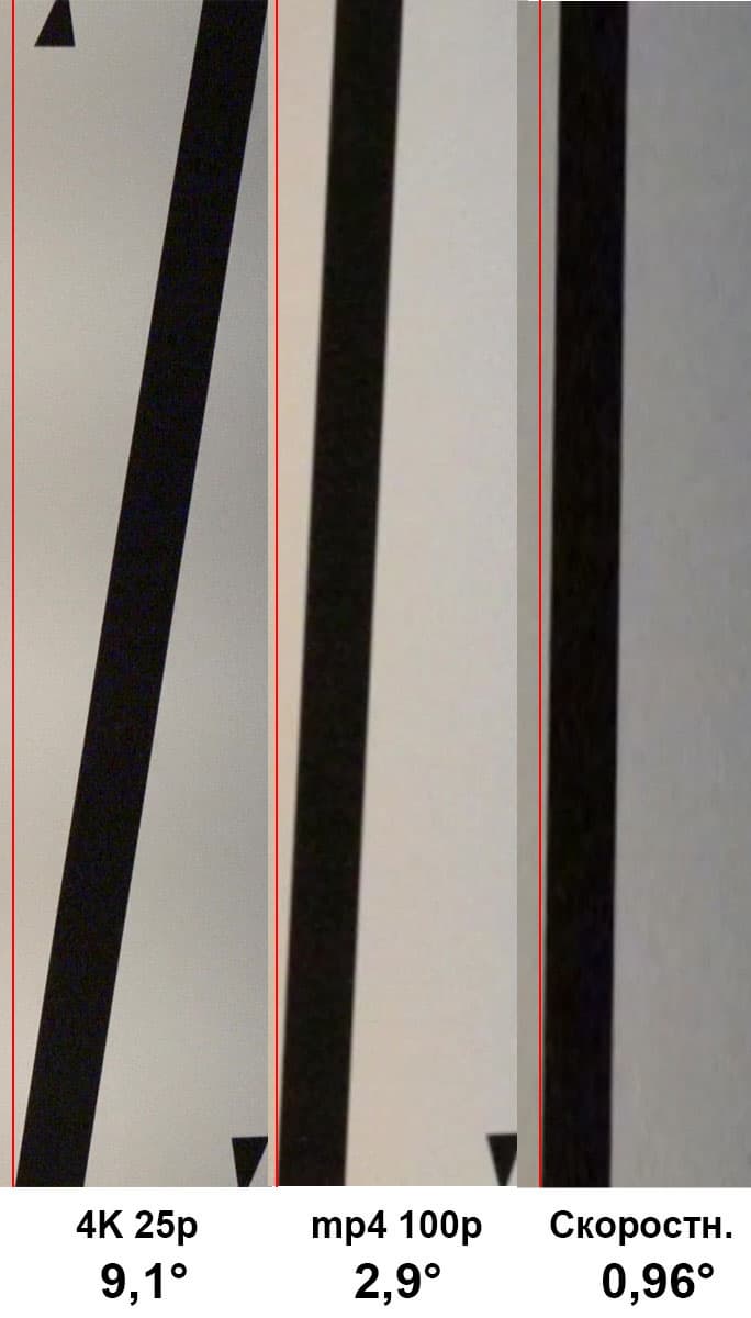 Ввиду большого количества пикселей в используемой матрице можно ожидать наличие высокого уровня роллинг шаттера (подробнее см. в материале Роллинг шаттер в видеосъемке — описание дефекта, примеры, пояснения). Для начала измерим этот уровень синтетически, выяснив лишь одну составляющую данного дефекта съемки — степень наклона вертикалей.