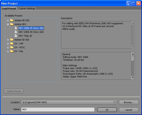 В отличие от рассматривавшейся SONY HC3E, сегодняшний аппарат ни разу не закапризничал, хотя используемое программное и аппаратное обеспечение ничем не отличалось от использовавшегося ранее. Для захвата в программе Adobe Premiere Pro 2.0 необходимо создать проект со следующими свойствами: