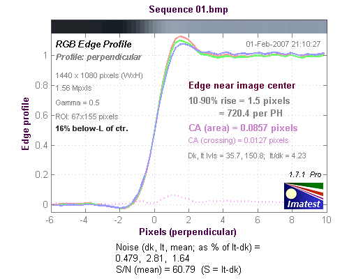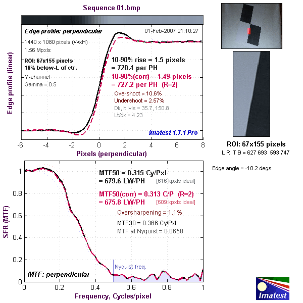 Верхний график представляет собой краевой профиль, для которого приведено значение 10-90% rise distance в пикселях, а нижний график является MTF (Modular Transfer Function — функция передачи модуляции), для которой приведен параметр MTF50 в циклах на пиксель. Краевой профиль и MTF камеры показаны черной линией. Красной пунктирной линией обозначен краевой профиль и MTF, которые программа Imatest считает близкими к оптимальным. 10-90% rise distance и MTF50 также являются расчетными величинами Imatest. Расхождение, как видно на рисунке, если и есть - то оно мизерное.