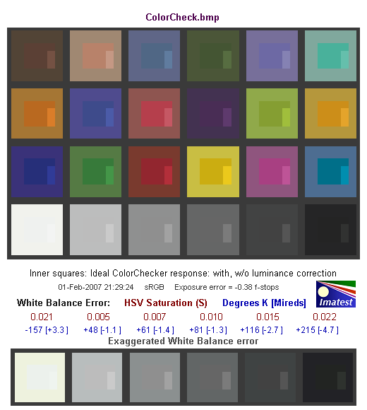 Средняя строчка цифр показывает нам численную оценку ошибки баланса белого в единицах цветового пространства HSV. Так, цифры красного цвета обозначают ошибку по координате S — saturation (насыщенность), цифры синего цвета — в градусах Кельвина [Миредах (Mireds)]. При значении S < 0.02 (речь идет об ошибке по координате S в HSV), ошибка практически незаметна, а при ошибке S > 0.10 она видна, особенно на нейтральных полях большой яркости.