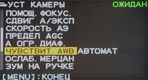 - баланс белого можно выбрать, нажав кнопку WHT BAL и поворачивая все тот же дисковый переключатель, при этом доступны такие элементы, как УЛИЦА и ПОМЕЩЕНИЕ, а также две пользовательские установки, заранее заданные владельцем.