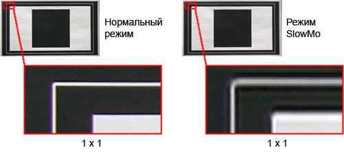 Четкость границ фигуры стала гораздо ближе к четкости кадра, снятого в обычном режиме. Таким образом, можно предположить, что во время замедленной съемки изображение, записываемое в буфер камеры, имеет размер, примерно равный размеру кадра DV, то есть 720 x 576 точек. И лишь во время извлечения информации из буфера памяти и записи ее на кассету картинка искусственно растягивается до размеров HD, увеличиваясь в те самые 3,75 раза.