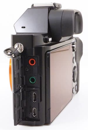 Основные интерфейсные разъемы расположены по левому борту фотоаппарата, и прикрыты пластмассовыми дверцами. Здесь находится микрофонный вход, выход на наушники, фирменный мультиразъем, выполненный по стандарту Micro-USB, но сочетающий в себе аналоговый аудио/видеовыход и порт USB, а также видеовыход HDMI, который при съемке абсолютно бесполезен. Такое блокирование HDMI производится из маркетинговых соображений, а цель действа проста, как орех: камера с разблокированным выходом преподносится как продвинутая, более дорогая модель, со всеми вытекающими отсюда финансовыми последствиями.