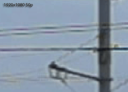 Здесь мы видим первый подвох. Что случилось с самым старшим режимом, 1920×1080 50p? Отчего стопкадр, взятый из такой съемки, сильно-сильно напоминает стопкадр из младшего, интерлейсного режима записи? С одним лишь отличием: в режиме 50p границы объектов становятся более резкими, чем в режиме 50i. Это что же получается? Режим 1920×1080 50p сделан искусственно из интерлейсной картинки? Или, может, вследствие недостатка мощности процессора информация в режиме 50p снимается с матрицы с известным прореживанием строк? Разницу между некоторыми режимами можно увидеть с следующей мультипликации, где исследуемая зона кадра с наклонными проводами увеличена в три раза: