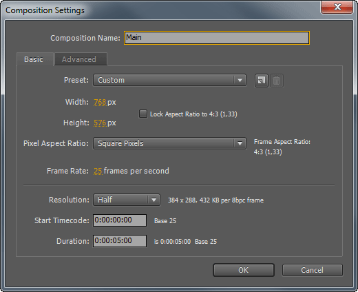 В начале работы создадим новую композицию с размерами кадра, которые вам необходимы. Дадим какое-нибудь запоминающееся название этой композиции, впредь она будет основной.