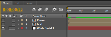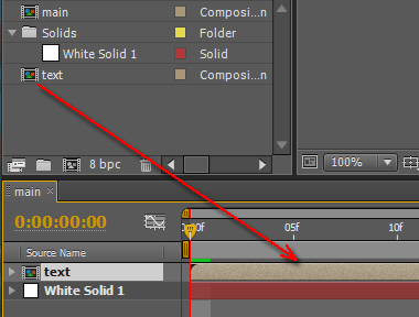 Следующий шаг: нужно перетащить в нашу главную композицию Main только что созданную композицию Text, зацепив её мышкой в копилке проекта и бросив на таймлинию поверх слоя Solid.