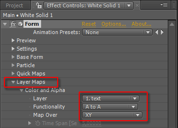Во вкладке Effect Controls (F3) появится данный плагин (на окно монитора пока не обращайте внимания — там высветился какой-то прямоугольник). Нам же необходимо связать этот плагин с композицией text, где находится готовый для трансформации титр. Делается это изменением параметров Layer Maps, где в первом выпадающем списке необходимо выбрать название слоя с текстом (в нашем случае он так и называется — text), параметр Functionality назначить "A to A" (от прозрачности к прозрачности), и в заключение установить направление обработки — XY.