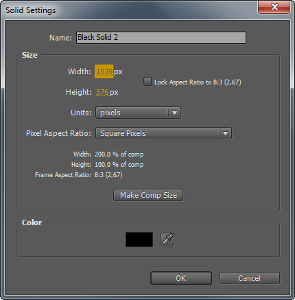 Создадим еще одну секвенцию, назовём её Рампа. На ней создадим новый Solid черного цвета с размерами по горизонтали в два раза большими, чем ширина нашего кадра.