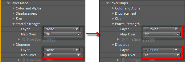 Теперь снова зайдите в настройки плагина Trapcode Form, и обратите внимание на параметры раздела Layer Maps: Fractal Strength и Disperse. Выберите в выпадающих списках Layer слой Рампа, а в списках Map Over — значение XY.