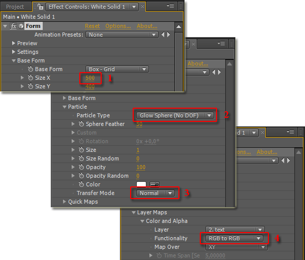 Первое, что следует сделать — измените размер базовой формы (параметр Base Form). В нашем случае для приведения пропорций логотипа оказалось достаточным изменить размер по оси X с 400 до 500 (1). Следующим шагом будет добавление зрелищности путём изменения типа частиц на светящиеся сферы (2). В-третьих, измените параметр Particle -> Transfer Mode на Normal (3). И, наконец, параметр Layer Maps также может нуждаться в изменении (4) — в каждом случае могут быть свои предпочтения, всё выясняется опытным путём.
