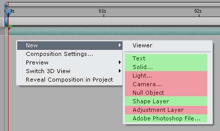 А тут — стоп. Использовать Particular стандартным образом, просто перетащив иконку эффекта на видеоклип, нельзя. Данный плагин, являясь, по сути, генератором частиц, должен иметь основу для работы, — слой, на котором все эти частицы будут создаваться и отрисовываться. Таким слоем может быть видео, рисунок, да что угодно — за исключением некоторых специальных, создаваемых непосредственно в After Effects, объектов. На рисунке далее, красным цветом выделены объекты, которые нельзя использовать в качестве заготовки или слоя. Выделенным зеленым цветом пунктам вполне можно присваивать эффект Particular, и начинать с ним работу.