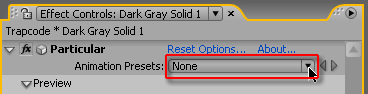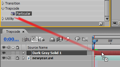 Следующий шаг — подготовка поля деятельности для Particular. Создадим любой из указанных выше объектов — пусть это будет слой Solid любого цвета. Вновь созданный слой автоматически разместится над уже существующим видео. Теперь перетащите иконку плагина Trapcode Particular на слой Dark Gray Solid 1, и отпустите кнопку мыши.