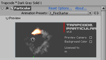 Создайте еще один слой, однако расположите его под существующим слоем с эффектом. Почему под ним, а не над ним? Искры будут разлетаться в разные стороны, следовательно, какая-то часть искр должна быть скрыта от взгляда зрителя вылетевшим из хлопушки огненно-дымным объектом. Перетащите иконку эффекта Particular на новый слой, и перейдите в его настройки. На этот раз выберем предустановку с именем t_WipeStarsDots. Она, думается, подойдет как нельзя лучше.