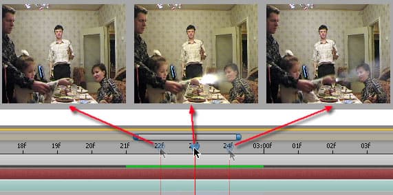 Зацепите курсором левый край слоя с эффектами, и перетащите его к ползунку, удерживая при этом клавишу Shift. Таким образом, слой с эффектом начинает свою работу только с этого кадра — момента взрыва хлопушки.