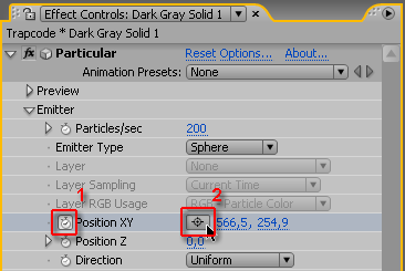 Исправляем "ошибку" разработчиков, не согласовавших действия с нашими планами. Изменим положение эмиттера в начале полета (при первом появлении) и его конце (эмиттер должен улететь за пределы кадра). Для этого зайдите в настройки эффекта, разверните вкладку Emitter, и отожмите кнопку с изображением стрелочных часов (1). Тем самым вы сотрете всю записанную в предустановке информацию о траектории движения эмиттера, нам она не нужна. Повторно нажмите эту же кнопку — начнется запись новой траектории. Чтобы установить точку старта эмиттера, нажмите кнопку в виде перекрестия прицела, находящуюся справа (2).
