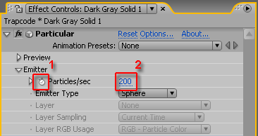 Одно плохо: в самом начале своей "жизни" эмиттер уже имеет плотность 200 частиц в секунду (см. настройки эффекта, строка Particles/sec). А ведь взрыв всегда появляется из ничего, вырастая с нуля до определенного значения. Давайте и это исправим, тем более — ничего архисложного нет. Установите ползунок времени на первый кадр эффекта, нажмите кнопку с изображением часов (1), и впечатайте значение 0 вместо существующего 200 (2).